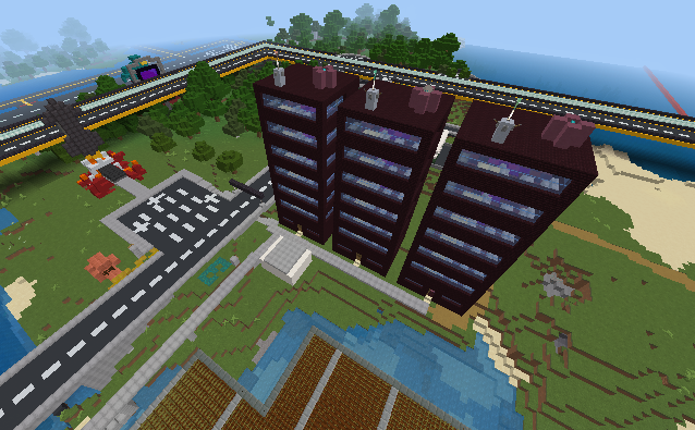 It contains 3 identical apartments, some public toilets, a small parking lot and a starship pad.